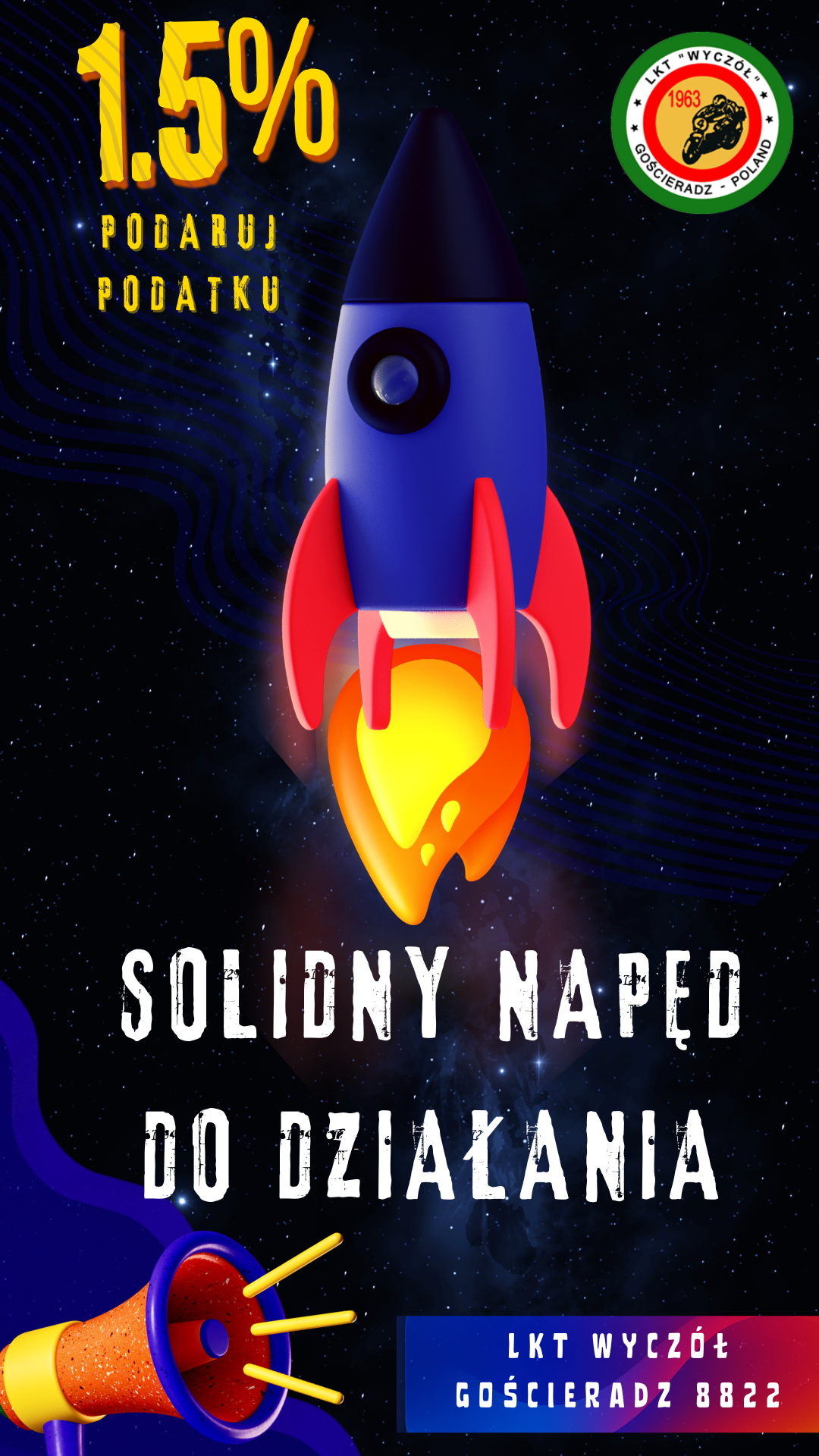 Każdy z Was może przekazać 1,5% podatku na rzecz LKT Wyczół Gościeradz. Nie potrafimy żyć bez dwóch lub/i czterech kółek i do tego potrzebujemy solidnego napędu. Każdą przekazaną złotówkę przeznaczamy na działalność, której celem jest rozwój i promowanie sportu samochodowego i motocyklowego oraz turystyki.